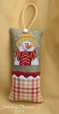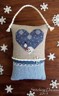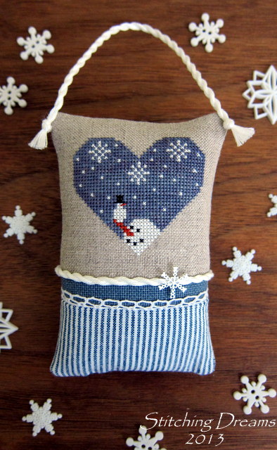 I just loved this little snowman when I saw him on Melanie's blog and she kindly offered to lend me her chart. Isn't he the cutest with that miniature snowman perched on his nose? This design is by Midnight Stitching and is called "Heartstruck Friends." I used the suggested DMC and overdyed threads and stitched it on 40 ct. flax Newcastle linen. To finish it off, I simply combined two coordinating fabrics, a bit of lace, some white cording, and topped it off with a tiny white snowflake charm. Thank you so very much, Melanie, for sharing your chart with me--I really enjoyed stitching him!