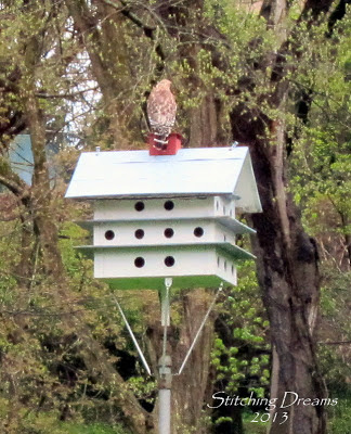 We also spotted this huge hawk sitting on top of our Martin house. Was he possibly surveying our pond for his next meal? We have koi, catfish, bluegill, and minnows in our pond which I'm sure he would enjoy getting a taste of! Or maybe he was just visiting the birdie condo trying to make friends with the many new birds that have recently moved in... I think he's just a bit too large to fit in those holes, don't you?