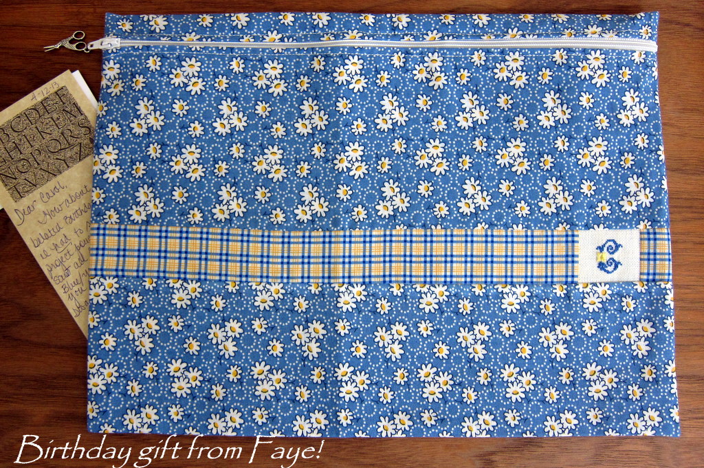 And arriving like a burst of Carolina sunshine came what Faye called a "belated, belated birthday gift!" I was so surprised and thrilled to open her package and find one of her beautifully stitched project pouches. She chose the colors especially for me in the prettiest shades of yellow and blue...And look at the tiny scissors charm attached to the zipper--adorable! Why, she even monogrammed it for me... I know most you are familiar with Faye's Carolina Stitcher blog, but if you aren't, please pay her a visit. You'll be inspired by her beautiful stitching as well as her finishing of many of our fellow stitchers' projects. Thank you again, Faye, so very much, for your special birthday surprise and for your friendship. I know I'll think of you each time I use your lovely gift...