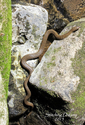 During our hike, I was most enchanted by the pretty red covered bridge, however this slithery creature was the highlight of the walk for the guys... They kept trying to see who could get the closest to it and I kept saying, "Stop, you guys, it might be poisonous!!" In researching it when we got home, it appears that it was a harmless Northern Water Snake. But, still, snakes rank right up there with bats in things I most fear! Anyone else feel that way?