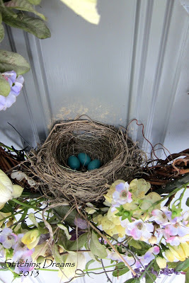 Do you see the nest? A mama robin had painstakingly built a nest right on my front door wreath! When we first saw it, there were no eggs and we planned to remove it after I had taken a photo for my blog. But, lo and behold, when I went out a few days later to photograph it--there were three eggs in that glorious shade of blue! So, of course, I couldn't remove the nest, could I?