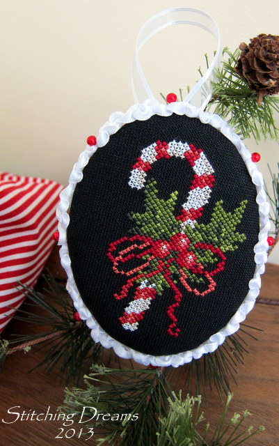 The snowman was my monthly ornament for March (yes, I'm way behind!) and for April I chose this cute freebie by Madame la Fée called "Candy Cane." If you're not familiar with her free designs, you're in for a treat! You can find this one and many others by clicking right here. I thought the candy cane would really pop on black so I used the suggested DMC threads on 32 ct. black Belfast linen. I finished it off as an oval with white ruched ribbon and pearly red pins... So, now I just need to stitch my ornament for May and I'll be all caught up!