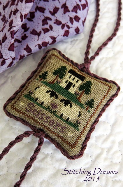 Now, on the flip side--a design I loved stitching was this Little House Needleworks piece. It will eventually be a scissor fob--just didn't have time to finish it for this post. It is from the chart "Wool Needlebook & Fob." And yes, I also hope to stitch the needlebook, too, at some point. Don't you love the sheep? And the colors--the purple just makes this design! This is stitched over one on 28 ct. dirty linen with the suggested DMC threads. I'll show you the finished fob next time--it will be my first fob finish, believe it or not!