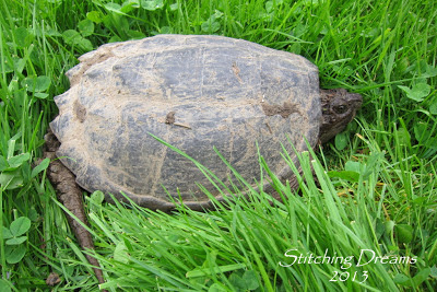 And just look at this creature! Smack-dab in the middle of our yard we discovered a snapping turtle. How he got there is a mystery; there was no trail through the long grass or anything!  But, look how muddy he is--he must have just crawled out of a hole in the ground or something...