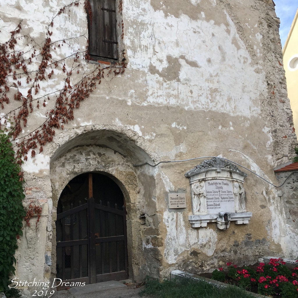 My husband and I were the only two exploring the graveyard that day making for a very peaceful visit. The crumbling remains of the Kunigunde Church sit quietly watching over the flower-covered graves.