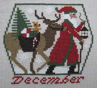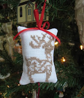 My fifty-second (and final!) ornament of the year is "Season's Greetings" from the Prairie Schooler's Christmas Samplers II chart. I wanted the ornament to be small enough to fit on the Christmas tree so I stitched it "one-over-one" on 28 ct. summer khaki lugana using DMC threads. I think my favorite thing that I've tried for the first time this year has been the "over one" stitching--I am truly hooked! I also added a gold cord trim and hanger and a gauzy golden ribbon to jazz it up a bit. I'll have to admit that as I put in the last stitch I felt a bit sad--my year is over and I've had such fun...